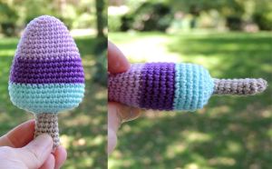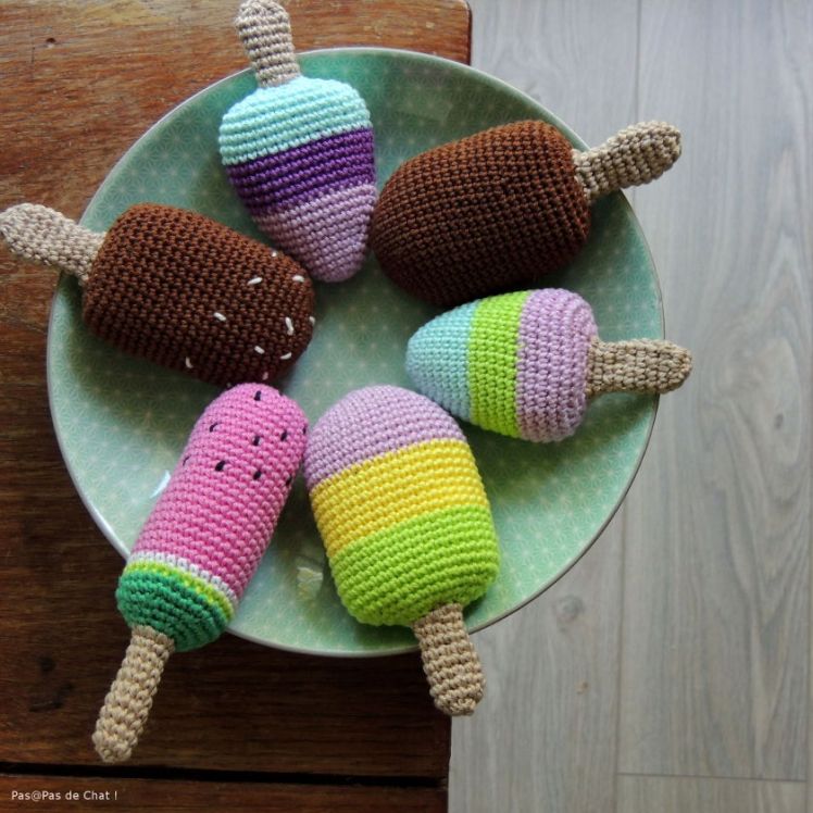 J’ai continué sur ma lancée en crochetant esquimaux et autres bâtonnets glacés. Je ne sais pas si c’est pareil pour vous, mais dès que je commence à faire une recherche sur internet, non seulement j’y passe des heures (ou des jours entiers), ma liste de projets s’agrandit de manière affolante, et je peux très facilement me retrouver sur un site de bouturages de plantes grasses (vous sentez le vécu ?) donc très loin de mon intention de départ. Après avoir relu le billet d’Audrey (ici), être allée voir le joli tuto d’Une fille à franges (ici), j’ai finalement crocheté au feeling.