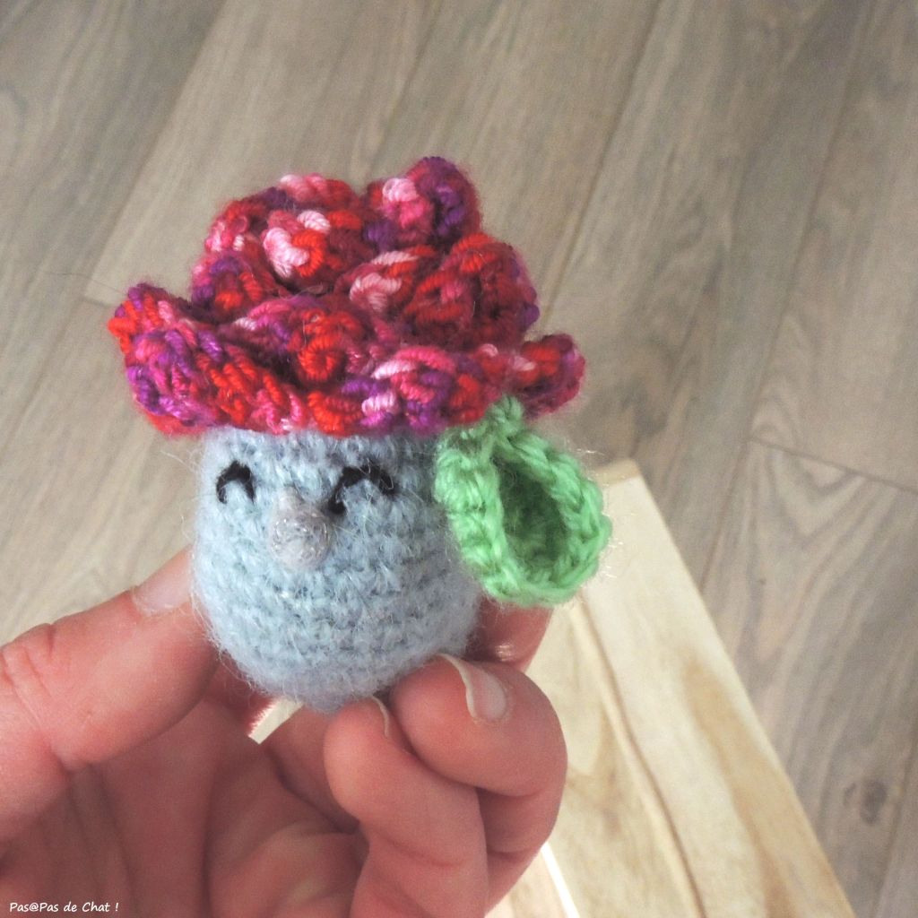 Une fois les yeux brodés, les becs formés et les pattes crochetées, ils ont absolument voulu se coiffer de fleurs trouvées dans cette fameuse boîte. Je vous assure que l’idée vient d’eux… Même si cela arrangeait bien mes affaires, jamais je n’aurais osé les affubler de la sorte !